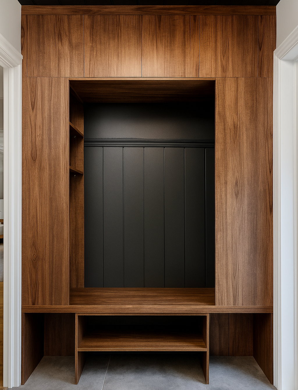 Conception sur mesure qui optimise l’espace d’entrée avec assise et rangement intégré.